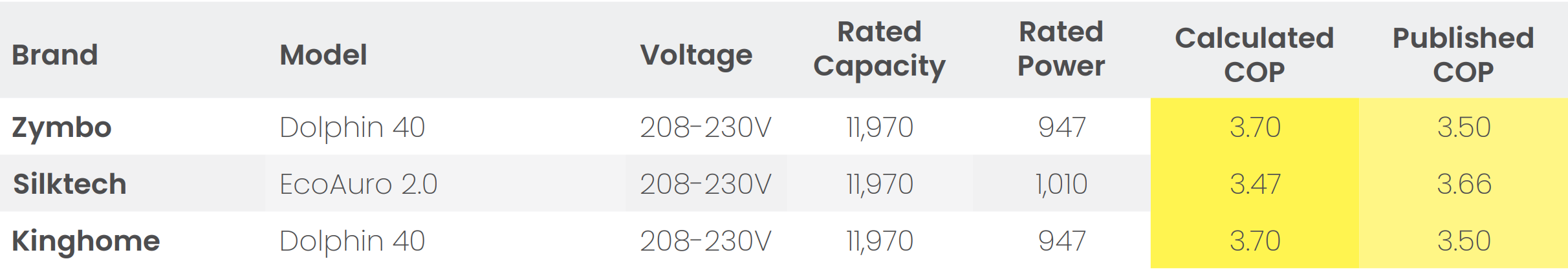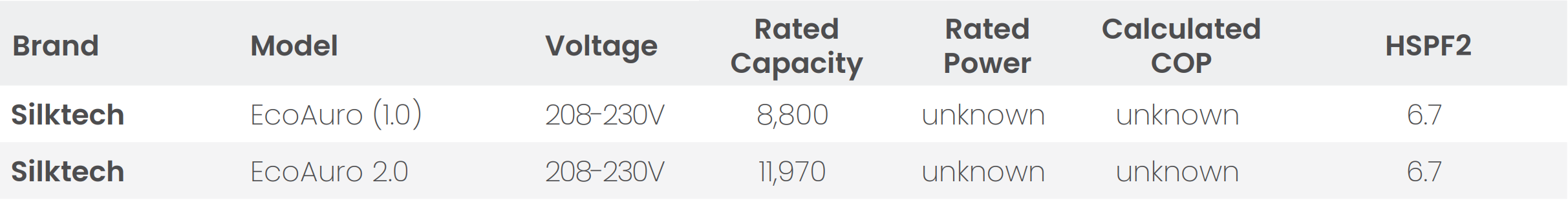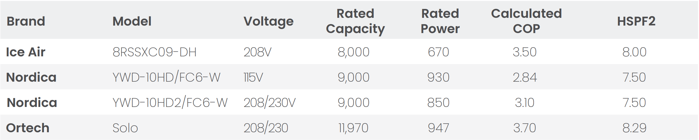 The three brands that publish an HSPF2 all conflict with the data. Does it make sense that Nordica, the manufacturer, claims a 7.5 HSPF2 based on 9,000 BTU, and Ice Air only achieves an extra half point to 8 SEER2 despite losing 1,000 BTU of capacity? This is especially absurd when ICE Air’s COP is 3.5, and Nordica’s is only 2.84? Or even better: are we to believe that Ortech somehow has an 8.29 HSPF2 with 11,970 BTU? These numbers defy basic thermodynamics.